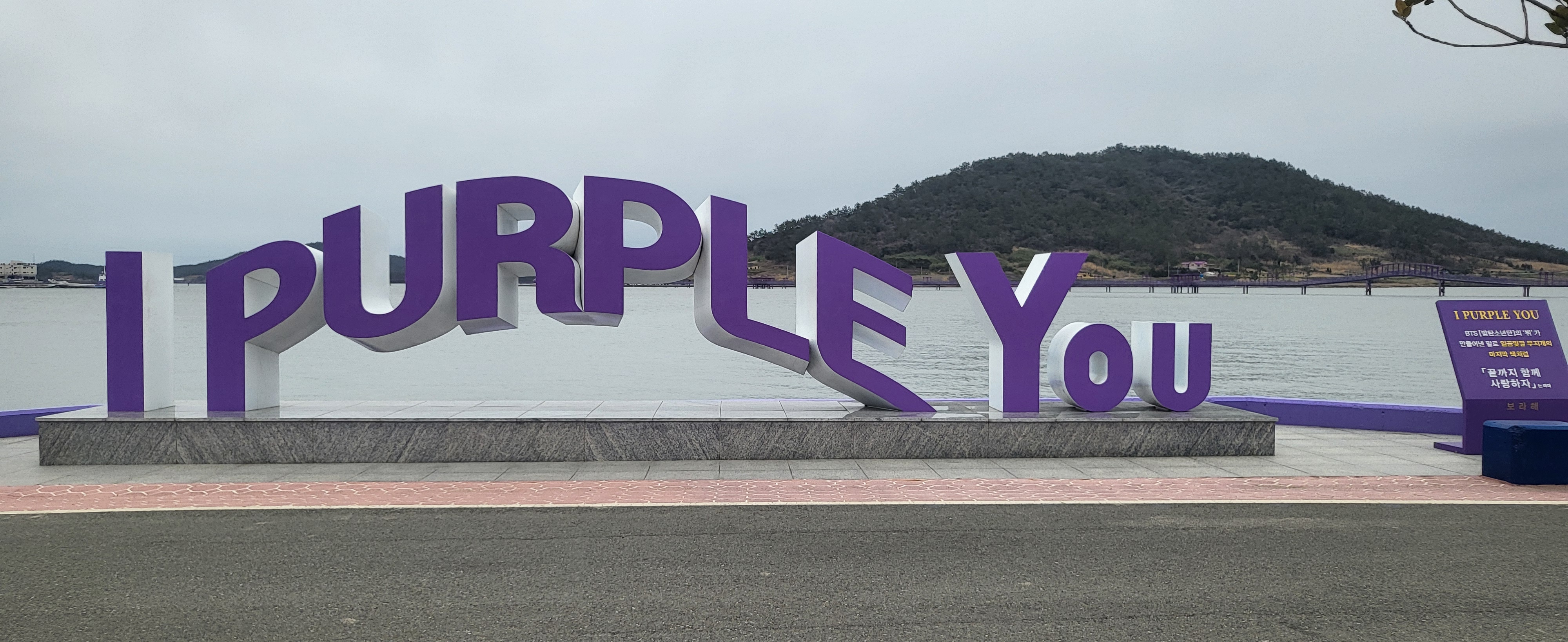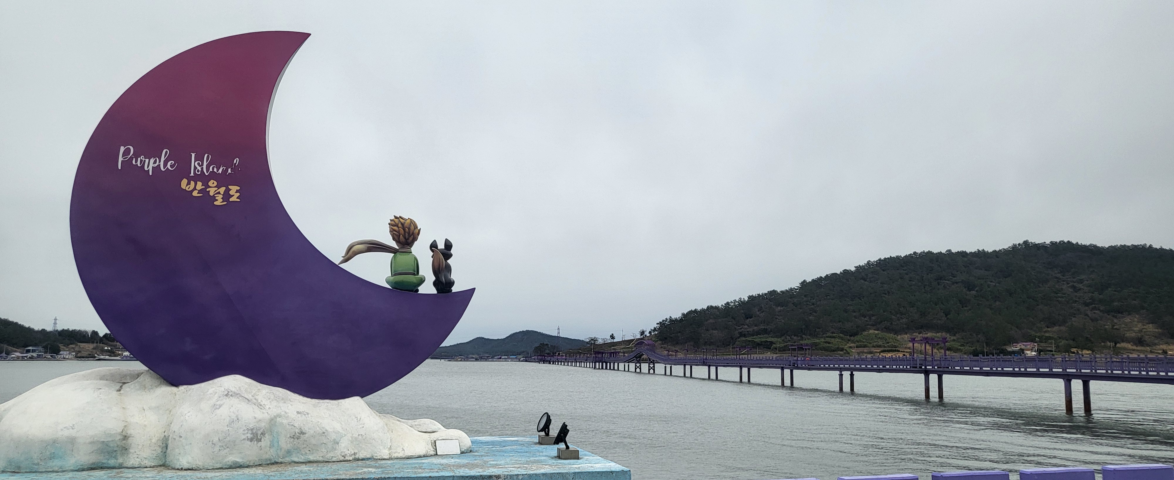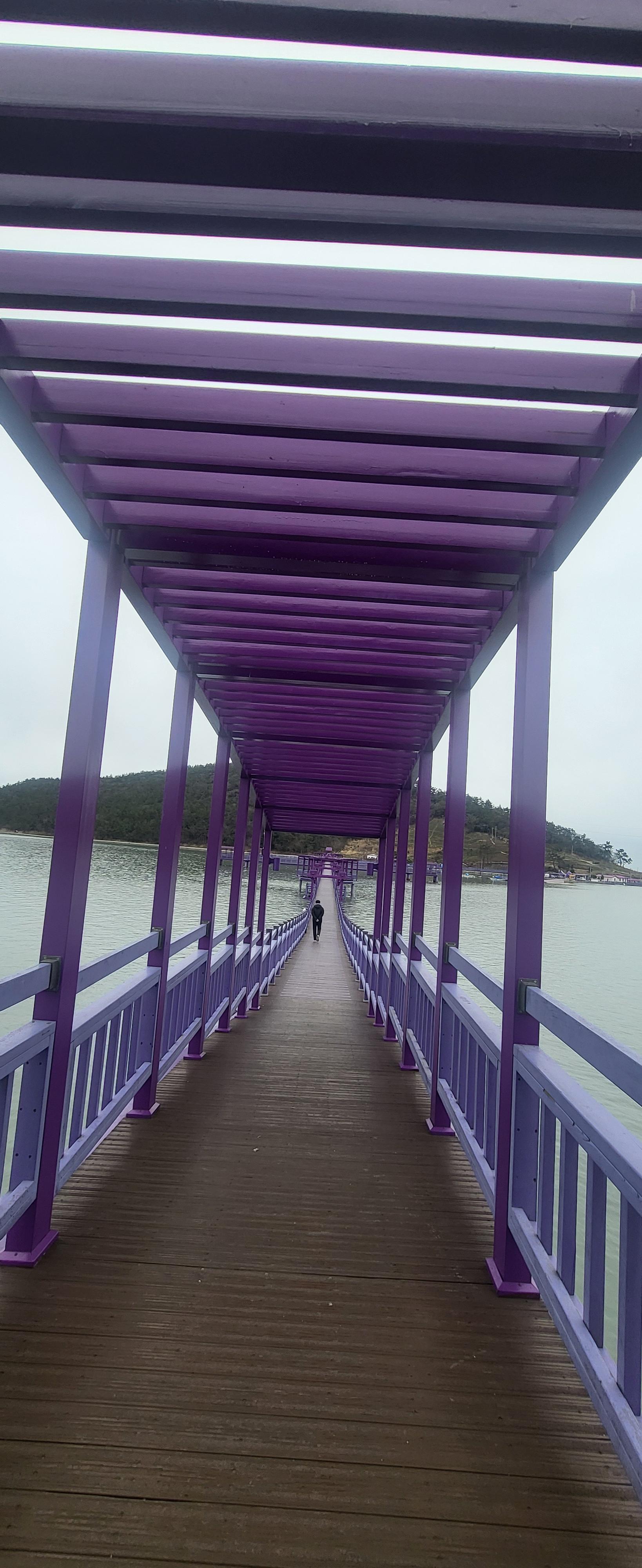 초입부터 보라빛으로 시작됩니다. 지역 기부자의 명단이 붙은 현수막이 보라색으로 여러번 붙어 있습니다. 좀 생소하지만 지역민들의 고마움에 표시라고 생각하고 지나칩니다. 비가 온다는 일기예보를 듣고 나왔기에 하늘은 회색빛이지만 섬둘레길를 걷기로 했습니다. 섬들을 이어주는 나무로 된 다리는 온통 보라빛입니다.